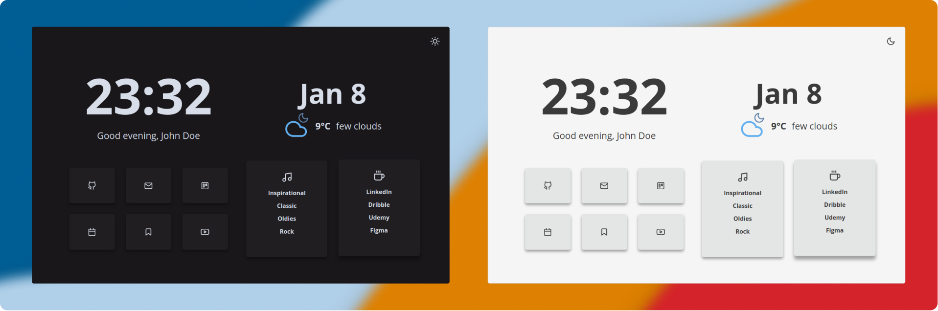 The theme can be automatically changed by the OS' current theme or personalized hours that you can change in the config.js file: